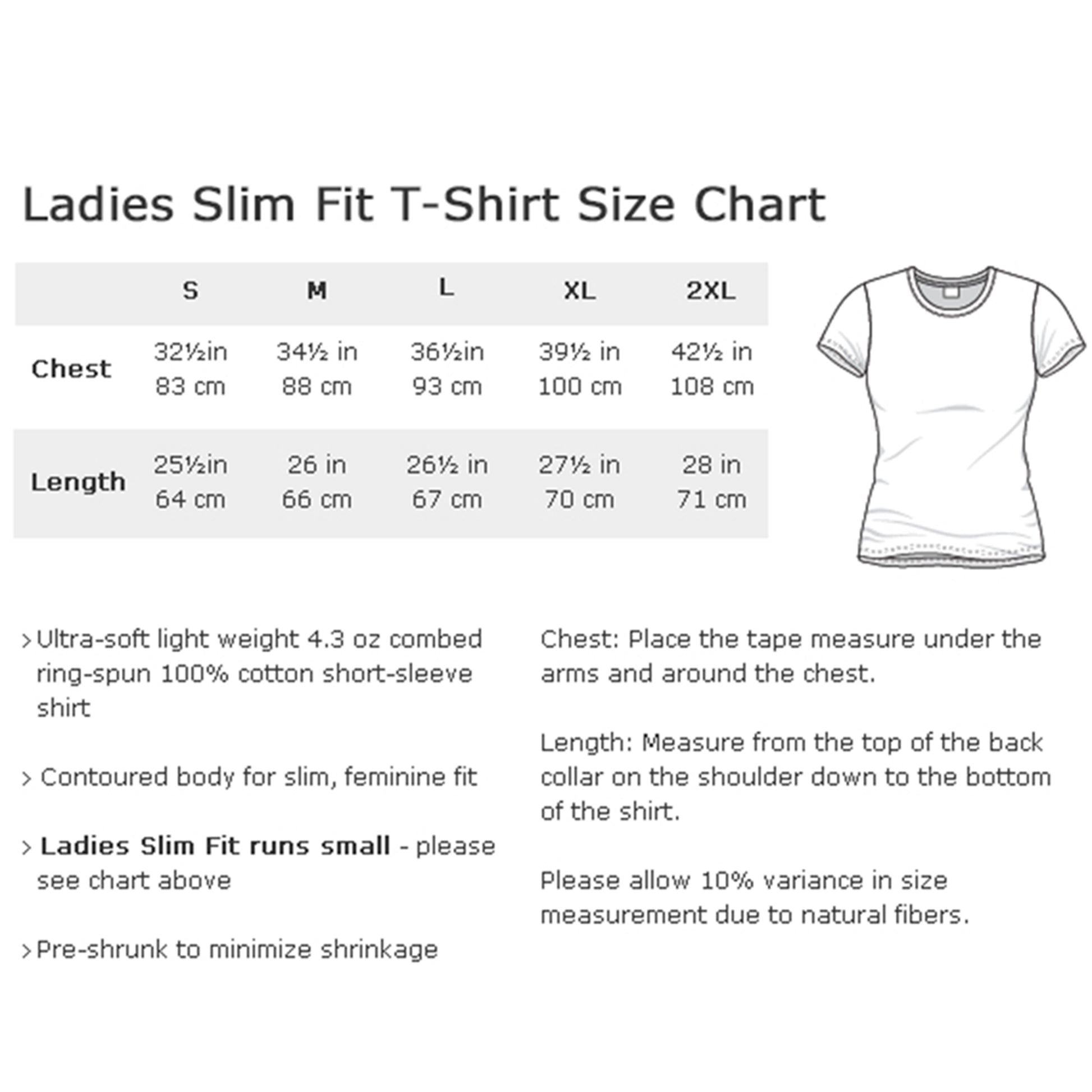 Please read the size chart in the images above for sizing information. Please keep in mind that Ladies Fit runs SMALL, with tight-fitting/slim-fit silhouette. If you prefer a looser fit, please order a size or two up, or order the Men's/Unisex T-Shirt version.