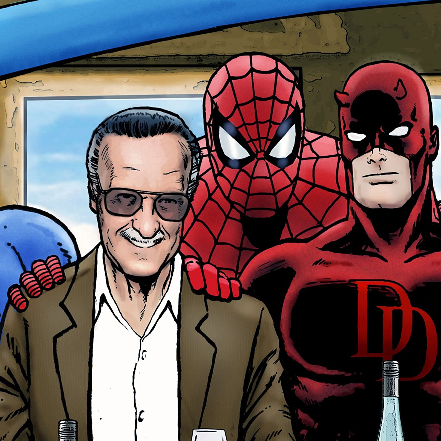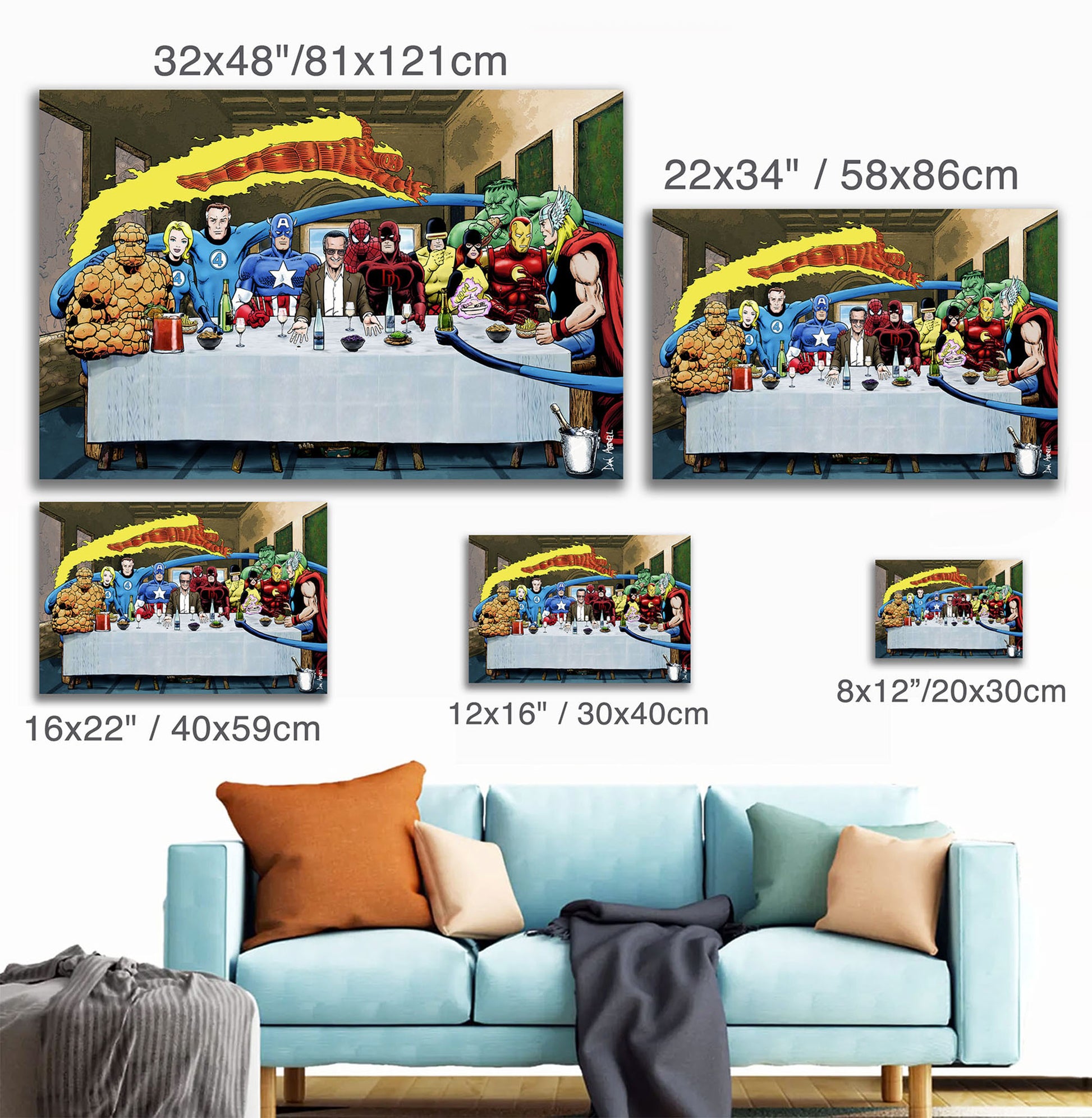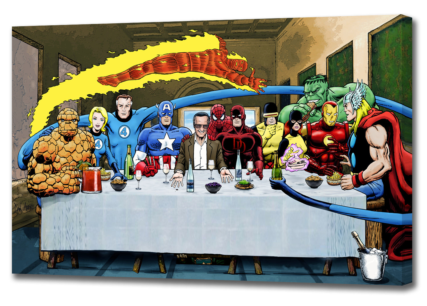 Marvel creator Stan Lee is surrounded by his co-creations in a Last Supper setting. Features The Fantastic Four, Original X-Men, Spider-Man, Daredevil & The Avengers... and one super-villain sneaking in.