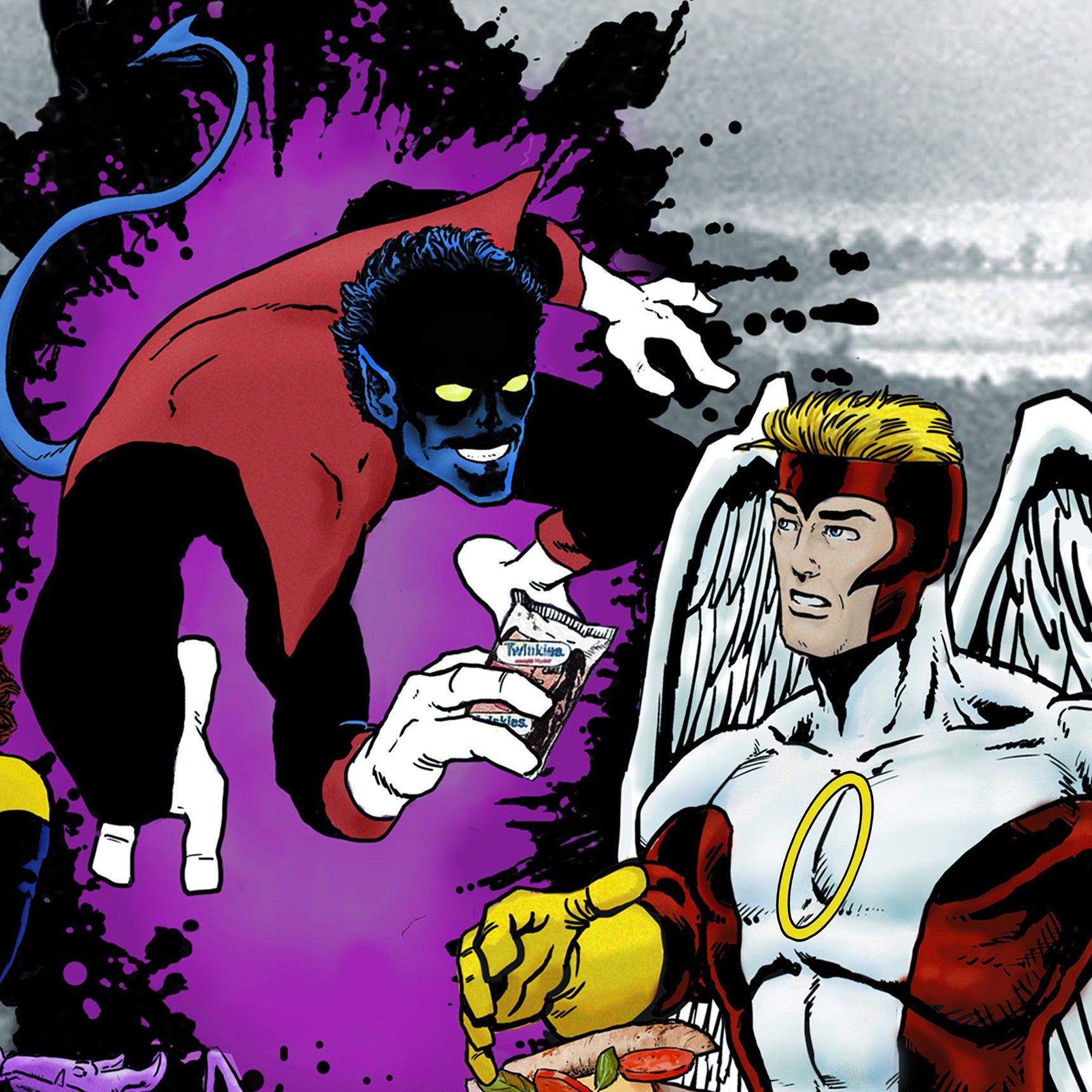 From left - Banshee, Cyclops, Phoenix,Wolverine, Colossus, Storm, Sprite, Nightcrawler, Angel, with Beast hanging underneath.